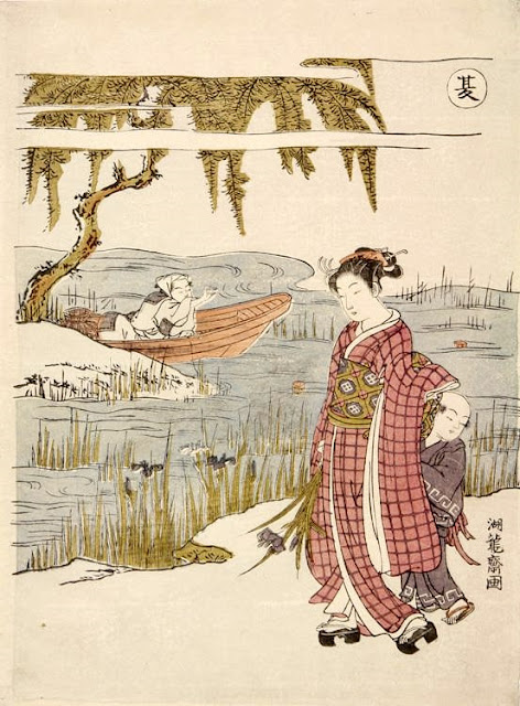 | Koryusai: Fisherman Waving to Girl on Shore |